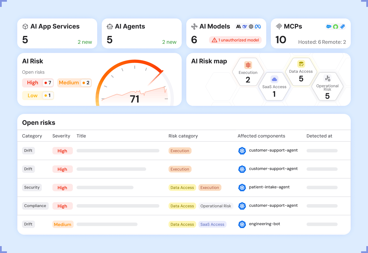 Gain continuous visibility into how AI systems operate in production. By generating a Runtime AI Bill of Materials (AI BOM), the platform maps active agents, models, tools, and data access paths while analyzing real execution behavior. This runtime view exposes shadow AI expansion, unauthorized model changes, and evolving system interactions before they introduce risk.