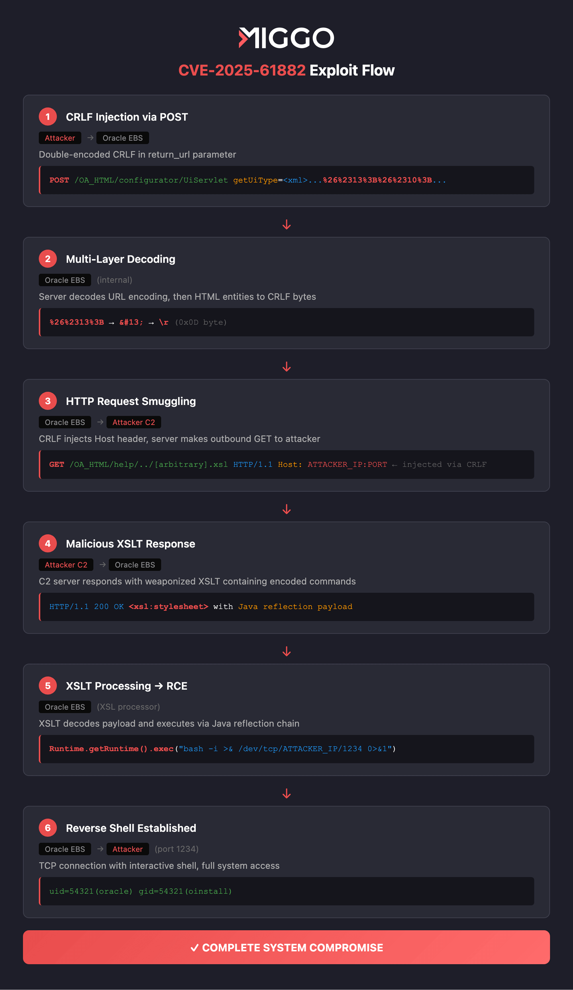 Oracle released an out-of-cycle security alert for CVE-2025-61882 on October 4th, 2025, fast-tracking the fix because the risk could not wait for a normal quarterly patch cycle. That out-of-band advisory is a sign that weaponization was a real and immediate concern at disclosure time. The exploit is quite advanced and involves chaining techniques such as: